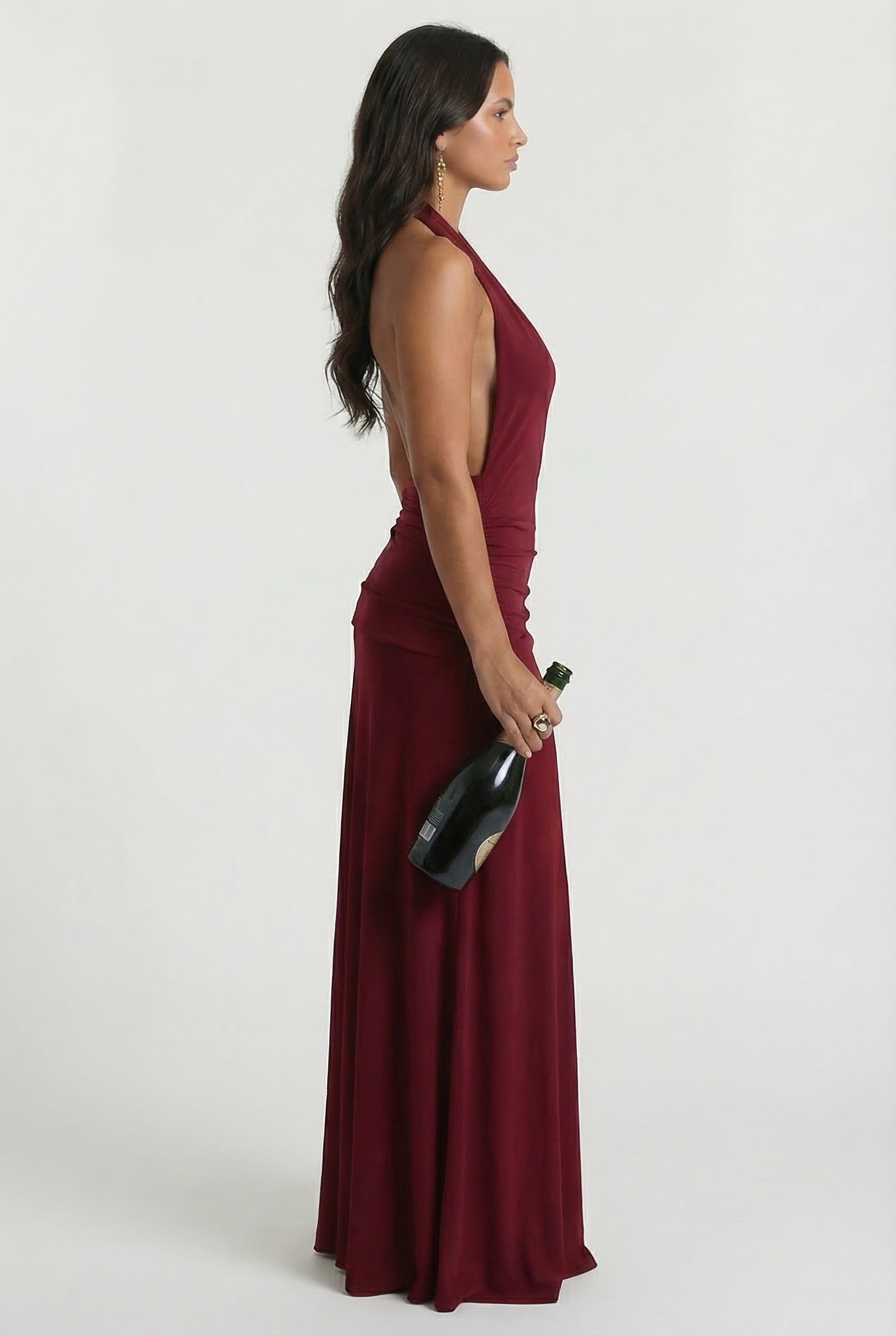 Este vestido largo destaca por su silueta fluida y su caída elegante que envuelve la figura con un acabado sofisticado. El escote halter con drapeado en el pecho aporta un toque sensual y favorecedor, mientras que el ajuste en la cintura y el detalle frontal estilizan la silueta. Diseñado para ocasiones especiales, combina elegancia y feminidad en una pieza única.