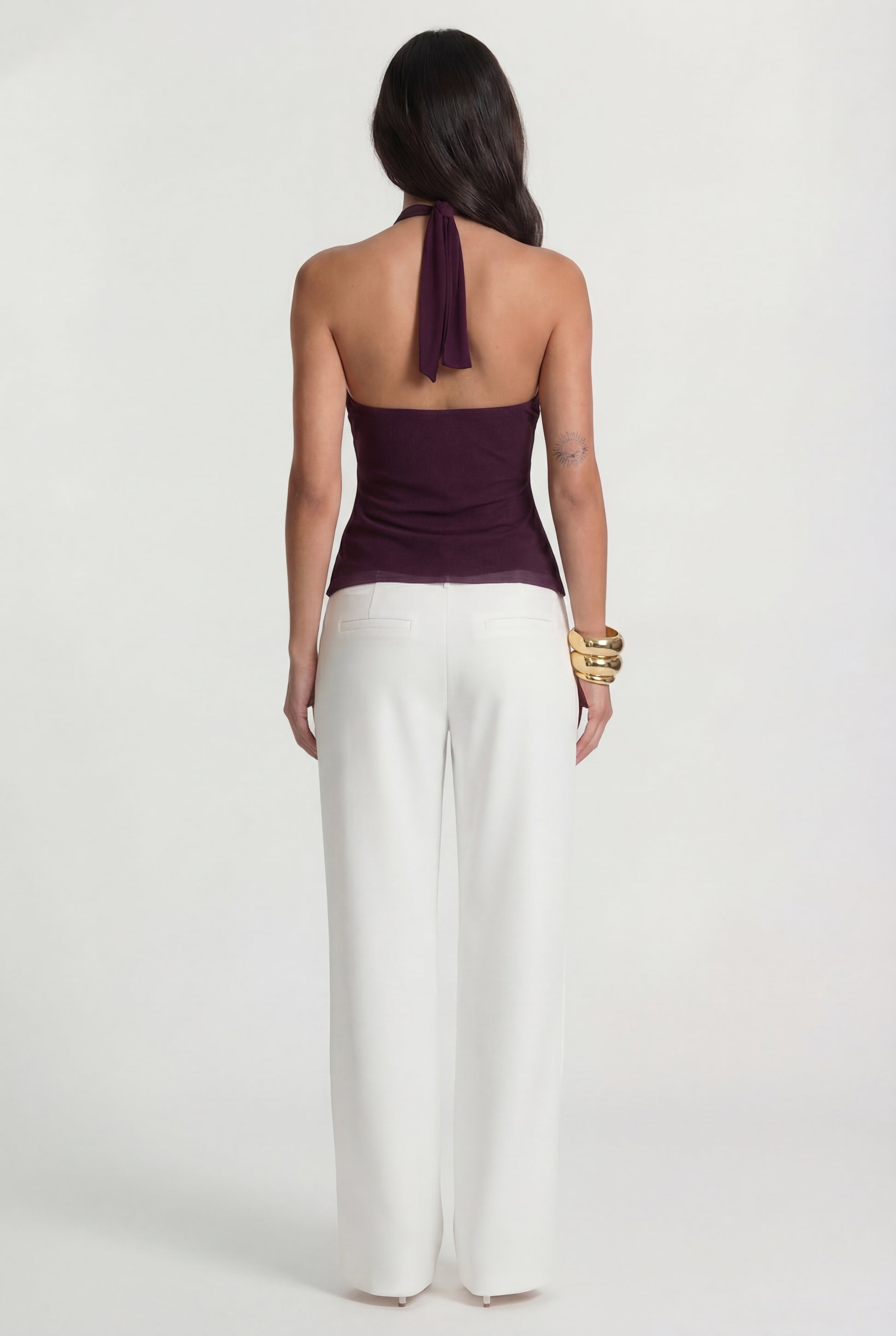 Top halter de silueta ligera que combina movimiento y elegancia de forma natural. El tejido fluido cae con suavidad.